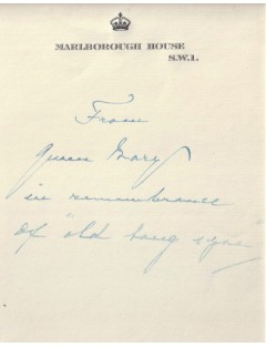 Discover this splendid autograph of Queen Mary of Teck, forever linked to history and culture through the majestic Queen Mary ocean liner. The elegant inscription — “From Queen Mary, in remembrance of old long...” — is a charming echo of bygone times. Written on fine stationery and mounted in a refined passe-partout, it is a remarkable collectible ready to enhance any distinguished collection.