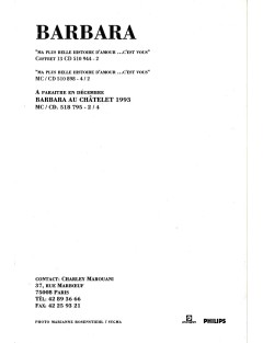 Issued by Philips / Phonogram to promote her box set “Ma plus belle histoire d’amour… c’est vous” and her concert album “Barbara au Châtelet 1993.”