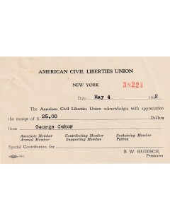 Das Ensemble wird durch eine originale Quittung der American Civil Liberties Union ergänzt, datiert auf den 4. Mai 1942, welche die Zahlung von 25 Dollar durch George Cukor bestätigt. Dieses offizielle, maschinenschriftliche Dokument trägt die Angaben der New Yorker Organisation und stärkt die Kohärenz sowie die Nachvollziehbarkeit des gesamten Ensembles.