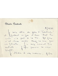 Support : Carte manuscrite sur papier à en-tête « Claudia Cardinale »