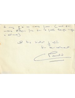 Scritta a penna a sfera blu su carta intestata personale (“Claudia Cardinale”), rivela tutta la sua umanità, la dolcezza e la sensibilità nei confronti di uno dei suoi interlocutori privilegiati, il celebre giornalista e critico cinematografico François Chalais.