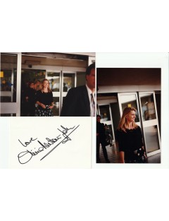 Magnificent and rare original autograph by Olivia Newton-John, signed in black felt-tip pen on a card measuring approximately 15 x 10 cm, obtained in person on May 12, 1992, at Nice Airport.