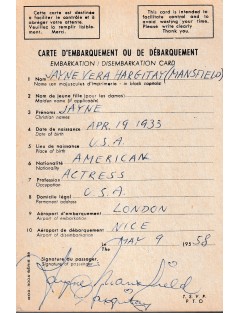 Es handelt sich um eine originale Ein- und Ausreisekarte, Format 10 x 15 cm, datiert auf den 9. Mai 1958, vollständig von Jayne Mansfield eigenhändig ausgefüllt und persönlich signiert.